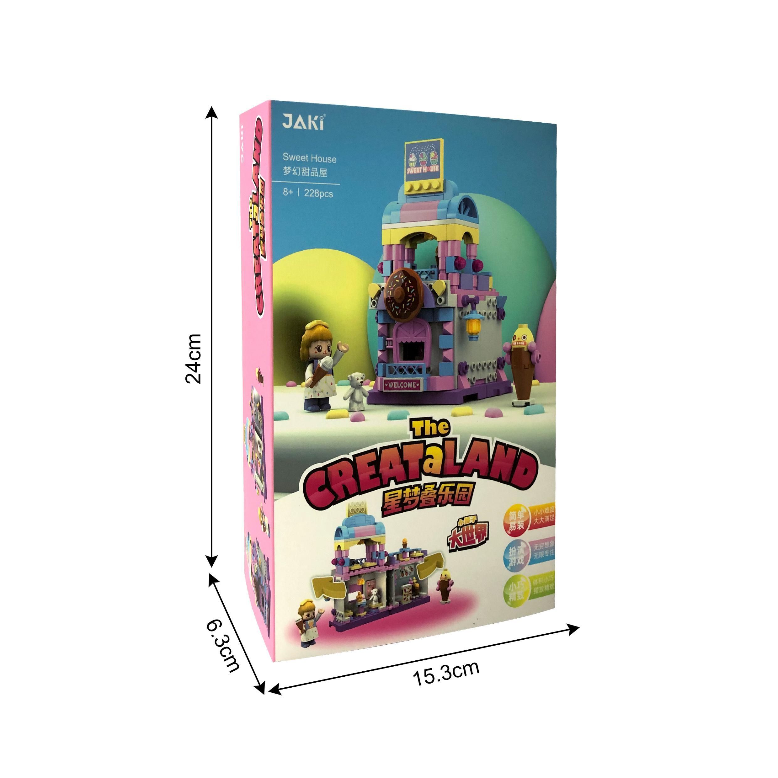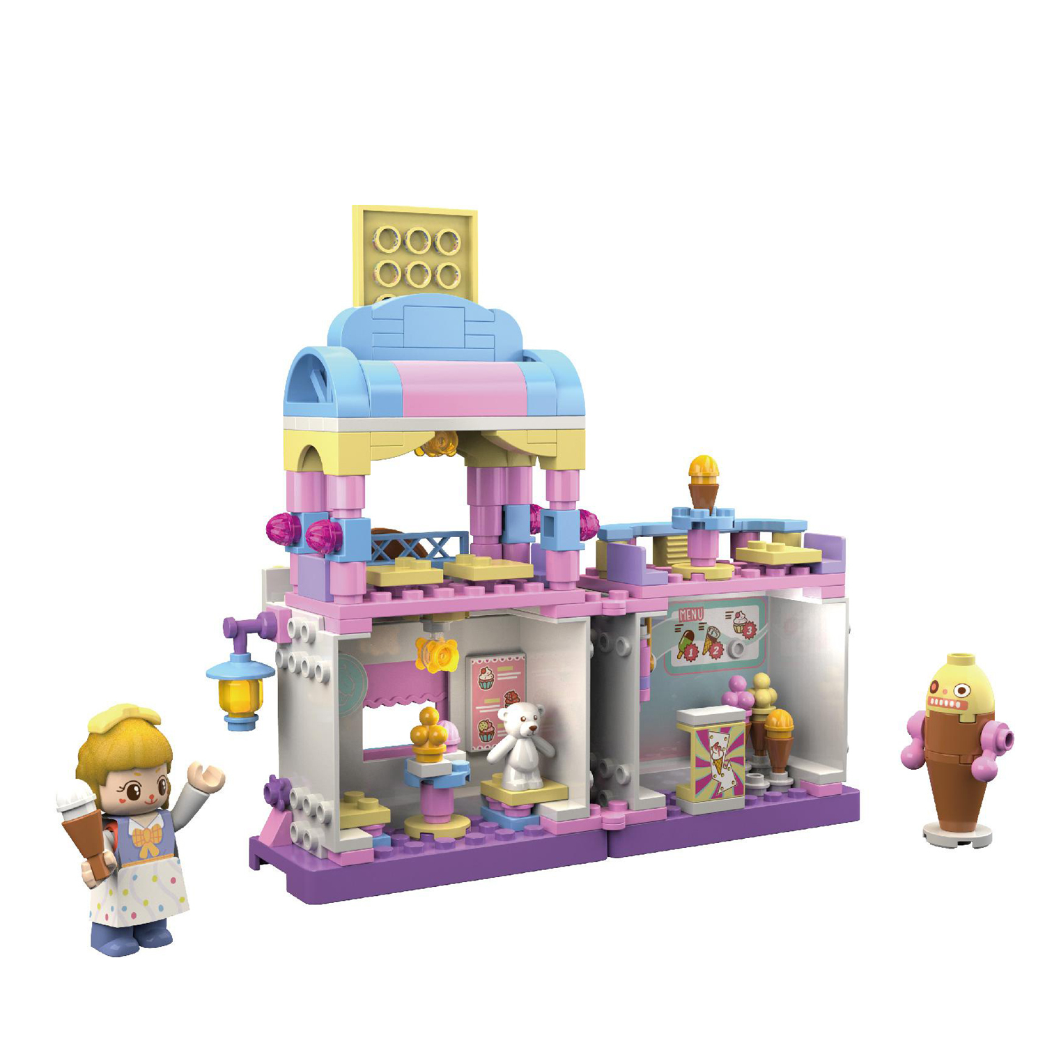 吃甜品的時候是快樂的,那么自己搭一個甜品屋,將會是快樂的升級版,我們希望每一位玩家可以在拼搭過程中感受到甜美的味道。粉紅、粉藍和粉黃,整個甜品屋都是粉色系,這顯然是為了女孩子量身打造的。唯一反差較大的,是墻上掛著的灑滿糖果的棕色巧克力餅干,因為它,香味已經彌漫整個甜品屋。整個甜品屋分為上下2層,底下是甜品售賣前臺,這里有五彩繽紛的冰淇淋、雪糕、雪球等,還有治愈系的的熊娃娃,一個人在這里享用美食也不會孤單。屋外還有一個智能服務機器人,有一種說不出的天然呆,制作好的甜品由它遞到客人的餐桌上。上邊一層是用餐區,制作出來的美味甜點在這里供客人享用。你喜歡哪種口味的甜品呢,在這里,你說了算。